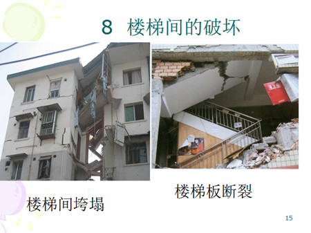 2、内外墙交接处的破坏:7度时开始有破坏,8度时普遍和严重,9度时可能甩出。纵横墙连接薄弱,地震中致使外纵墙大片闪落,唐山大地震此类震害较为明显。随着抗震设计对砌体结构纵横墙连接的重视,此类震害相应减少,但农村自建房中仍有此类震害发生。