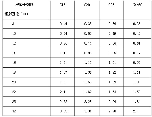 注:1、当混凝土强度等级不低于C40时,对抗剪强度最小值不低于21N/?2 的粘结剂,其植筋的系数a值乘以修正系数0.9。