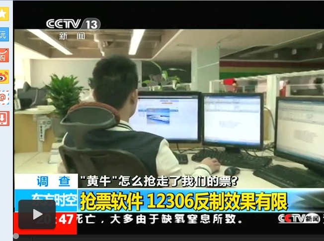 2014年1月8日央视报道了一则春运期间网络黄牛囤票案,加固公司揭示了黄牛们利用区别于商业网站“小打小闹”的抢票插件的付费抢票软件,十分钟刷走1245张火车票。调查发现,这种付费抢票软件,个人版每月50元,企业版每月两千到三千元。2013年12月25日记者与一名网络工程师从黄牛手中高价购买了企业级抢票软件,并用它来尝试购买2013年12月29日广州到北京的车票。G80次、T16次……10分钟就买到了1245张车票。