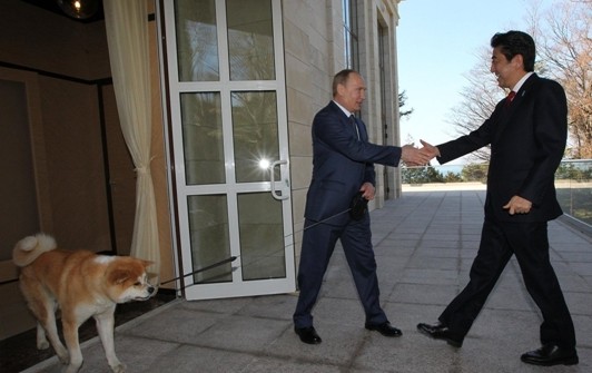 2012年7月访俄时送给普京的礼物是一只秋田犬,名字意思是“梦”,送的时候3个月大,现在已快两岁。普京在迎接安倍时专门带上它同安倍重会。俄罗斯媒体报道,见到Yume后,安倍用俄语说了一句“好狗”,普京回答说:“但它有时候也咬人。” 网友周龙然说 用狗迎接安倍真的恰当不过【普京牵着宠物狗会见安倍】 谢鑫少年本格推理 牵着狗……好吧,老普你赢了……【普京牵着宠物狗会见安倍】