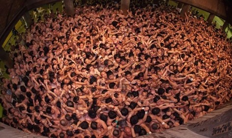 加固公司:2月16日几近全裸参加日本裸体节 声势浩大引人注目,日本裸体节在冈山举行,男子们缠着裹腰布进行庆祝。人们挤在一起,伸手争夺被扔出的幸运棒。大约9000男子参加到这一活动之中,试图争夺“宝木”。