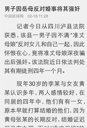 转发(19) | 评论(32) 15小时前 - 新浪微博 -灵山修行者-红尘已看破 【男子将准丈母娘深夜骗出强奸】 记者今日从四川泸县法院获悉,该县一男子因不满“准丈母娘”反对女儿和自己一起,因此怀恨在心,竟将准丈母娘深夜骗出后强奸。该法院近日依法判处其有期徒刑四年一个月。真光荣!鼓励!你厉害![good] [查看图片]