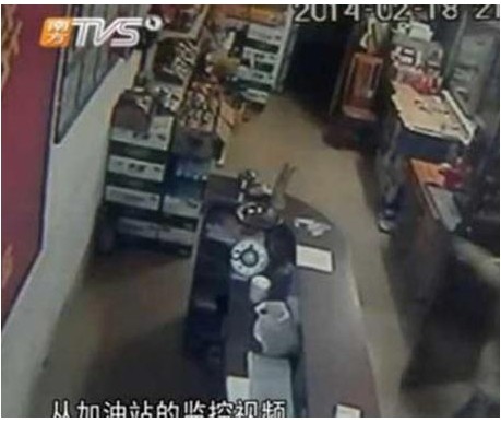起因疑为感情纠纷 杀了人的阿平之后沿着公路逃跑,并跑进路边的一家加油站躲避。加油站的监控视频显示,18日晚上9时,阿平斜挎着一个包披头散发冲进加油站内的商店,然后关门并将门死死顶住。这时一名男子追上从外面一脚将门踹开,随即一群人冲进去将阿平按倒在地。