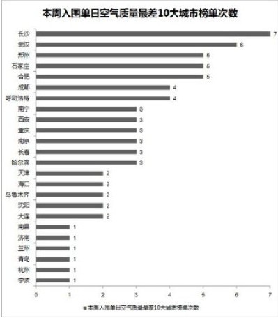 2014年3月10日北京人民网环保频道每日发布各直辖市、省会城市及计划单列市空气质量最差10个城市排行榜已有一周时间,现根据一周以来的各大城市空气质量指数加权平均进行排行,本周空气质量最差10个城市为:长沙、石家庄、长春、郑州、哈尔滨、呼和浩特、合肥、武汉、成都、重庆。在36个直辖市、省会城市及计划单列市中,长沙连续7天上榜空气质量最差10大城市,武汉连续6天上榜,其次合肥、石家庄、郑州均是5天上榜。