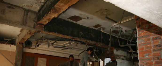 3.在保证立柱牢固稳定的情况下,拆除墙体,同时,根据梁的截面尺寸及支承长度 剔除梁下部墙体,清除杂物,为防止板原接头混凝土下落,可以按间距不大于1.5米增加钢支撑,并在梁混凝土浇筑范围内,模板支好后,沿楼板上沿从一端或两端依次浇筑梁混凝土 ,混凝土搅拌好后时间不要超过混凝土早期凝固长度。间距1m左右,开直径约150mm的混凝土灌注孔。