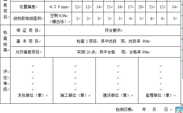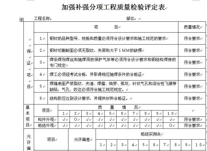 加固补强分项工程质量检验评定表 加固项目质量情况 加固资料怎么做 1 钢材的品种型号、规格和质量必须符合设计要求和施工规范的要求 符合要求 2 钢材切割断面必须无裂纹,夹层和大于1MM的缺愣 符合要求 3 焊条焊剂焊丝和施焊用的保护气体等必须符合设计要求和钢结构焊接的专门规定 符合要求 4 焊工必须经考试合格,并取得相应施焊条件的合格证 符合要求 5 焊缝表面严禁裂纹、夹渣、焊瘤、烧穿、弧坑、针状气孔和溶合性飞溅等缺陷,气孔、咬边必须符合施工规范规定。 符合要求 6 结构胶应达到设计要求,并提供材料合格证。 加固补强符合要求