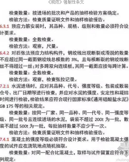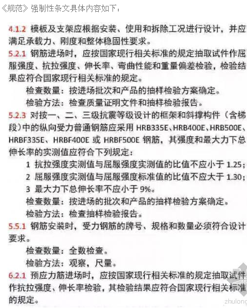 《规范》强制性条文由2002版的15条减少为9条,均为在2002版强条基础上修订而成。减少6条的原因为条文取消(施工技术要求在国家标准《混凝土结构工程施工规范》GB 50666-2011已有规定)和修订后不适合再强制(严重缺陷、严重偏差的处理和预制构件结构性能检验)。