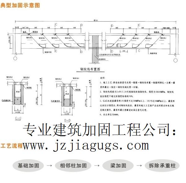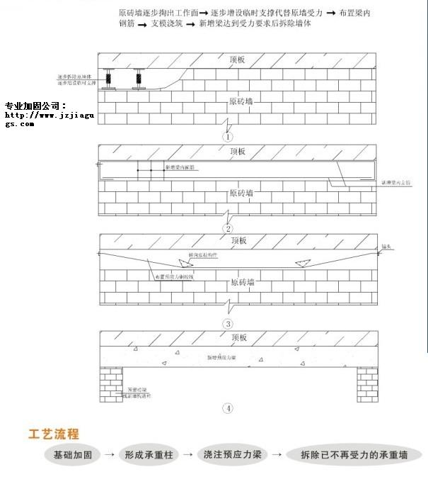 加固改造的总体方案是在被拆除墙体的顶部设置托换梁,以便将上部荷载通过托换梁传递给相邻的墙体或柱子,然后再传递给基础。这相当于使用一个内框架来取代原结构,从而涉及到托换体系的建立与设计,包括与之相关的托换梁的设计、竖向承重构件的加固设计以及基础的加固处理等。由于被改造建筑是对建筑物进行结构加固改造。这些老旧建筑物的结构形式大多为砖混结构,在加固改造过程中普遍涉及承重墙体的拆除,即原墙体承受的荷载将由托换梁承担,进而传递到竖向承重构件和基础。本文将结合工程实例介绍托换技术在砖混结构加固改造中的一些应用,并结合砖混结构托换的受力及构造特点分别研讨托换梁、竖向承重构件以及基础的加固改造方法和施工关键技术。